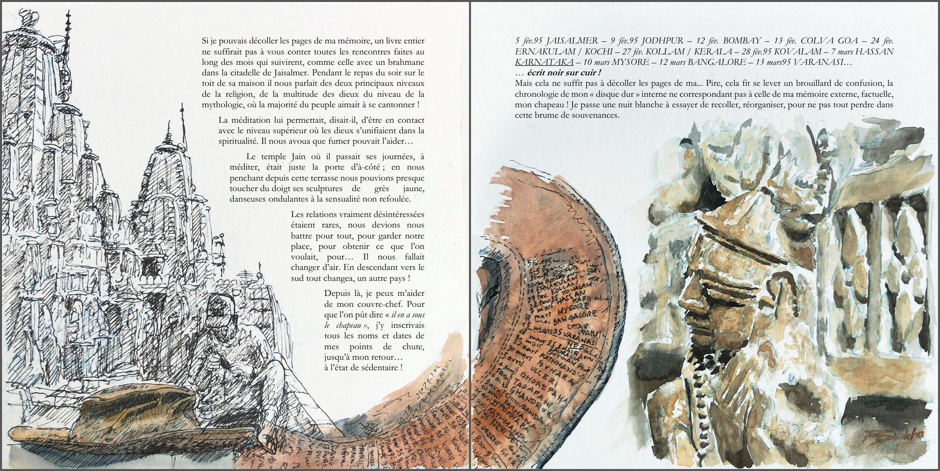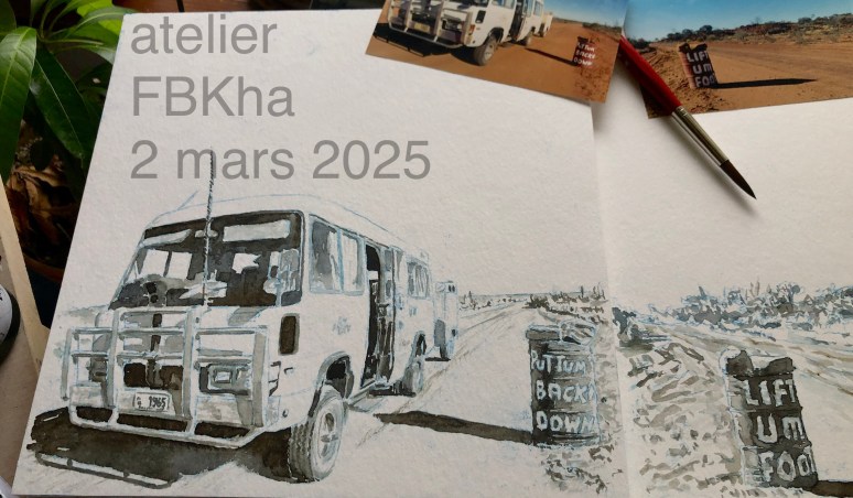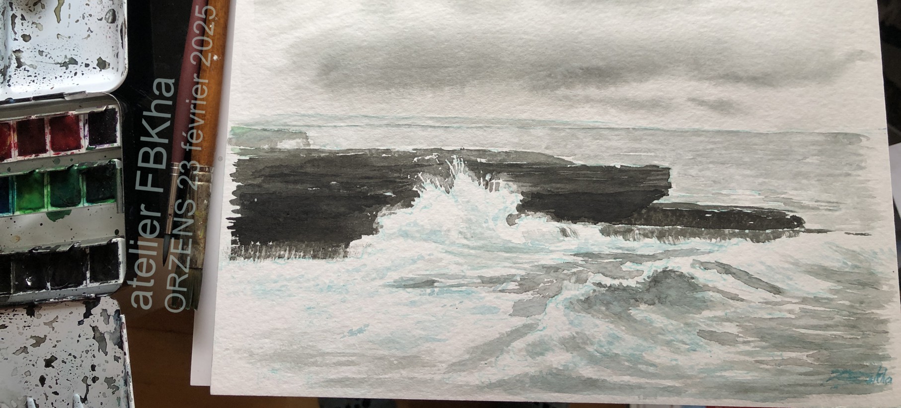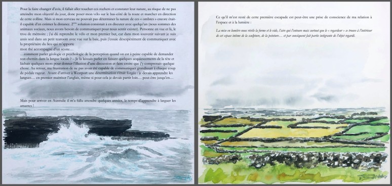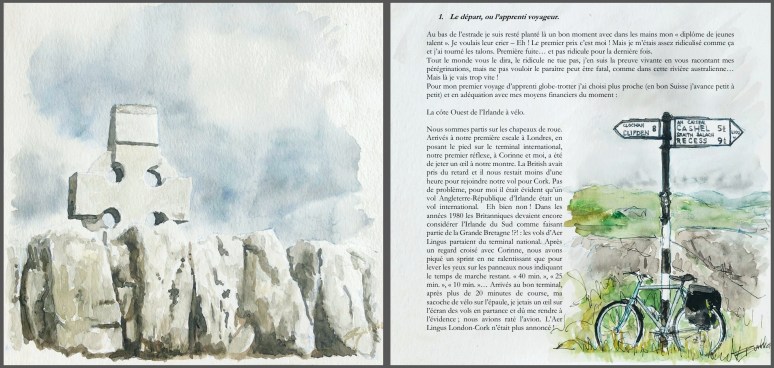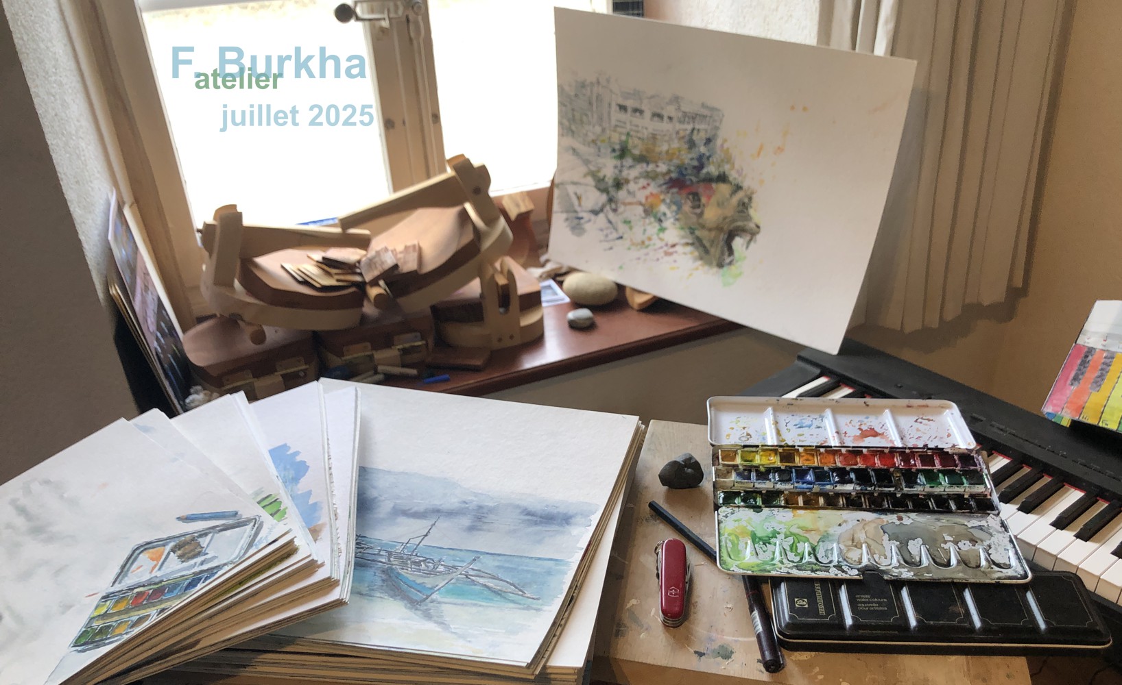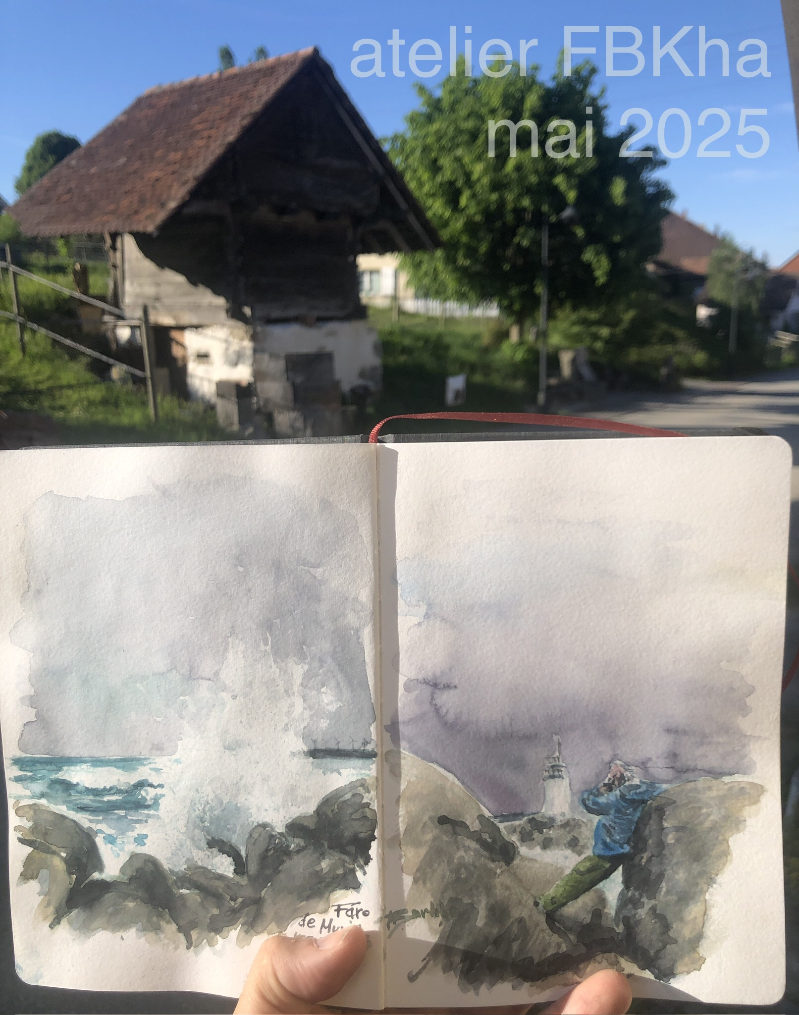 Cette aquarelle fait partie du projet de livre « Voyager en deux trous de mémoire » actuellement je prépare une version complétement illustrée de dessins et aquarelles au format 21/21 cm.