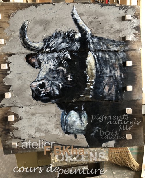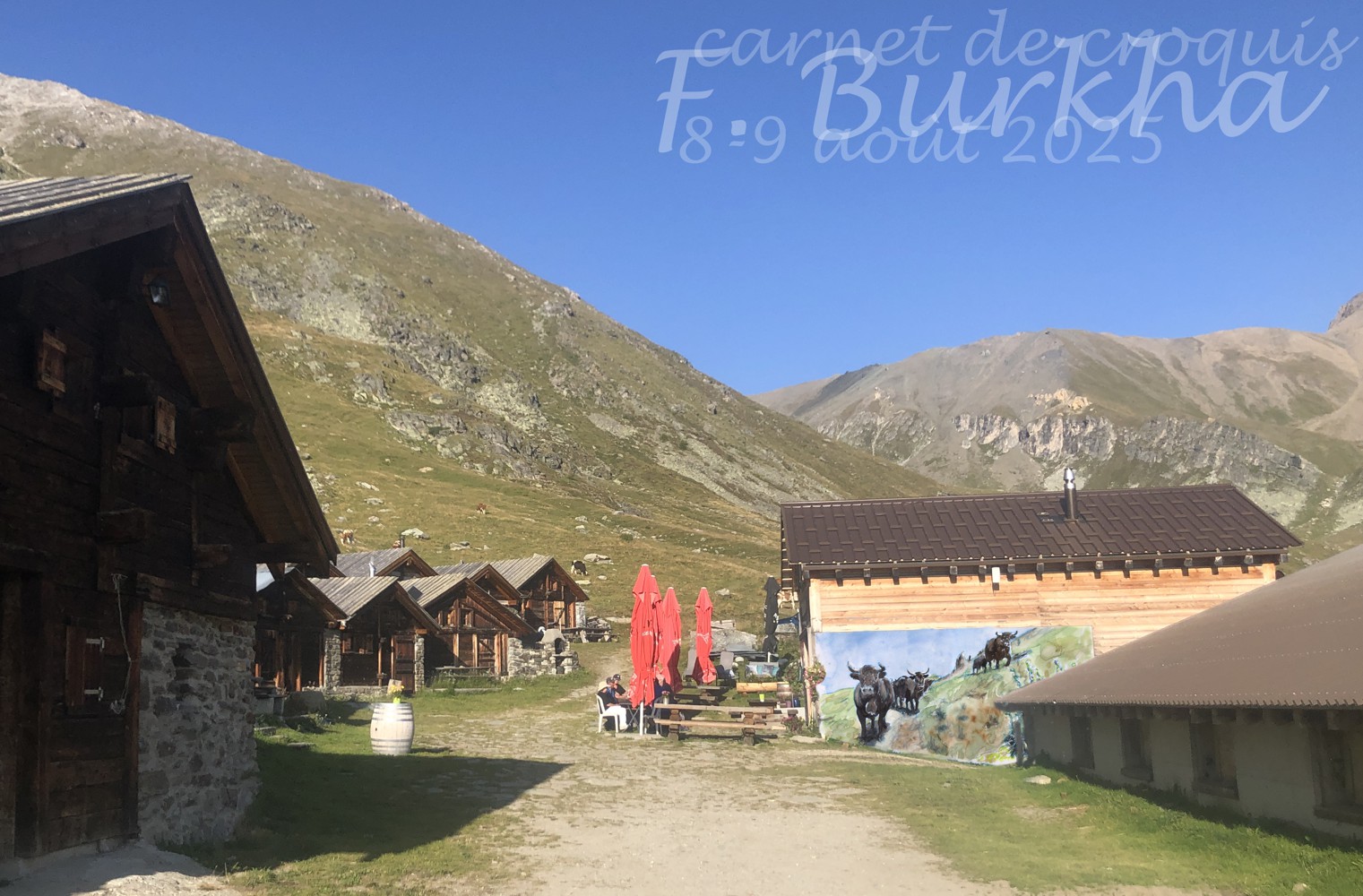 18h40. En arrivant à la buvette de L’A Vieille (E) on m’a demandé de faire un projet de peinture murale sur le mur de béton « qui nous accueil » à notre arrivée au centre des « chottes » (ancienne étables) : avec des vaches d’Hérens, du génépi ou des marmottes.