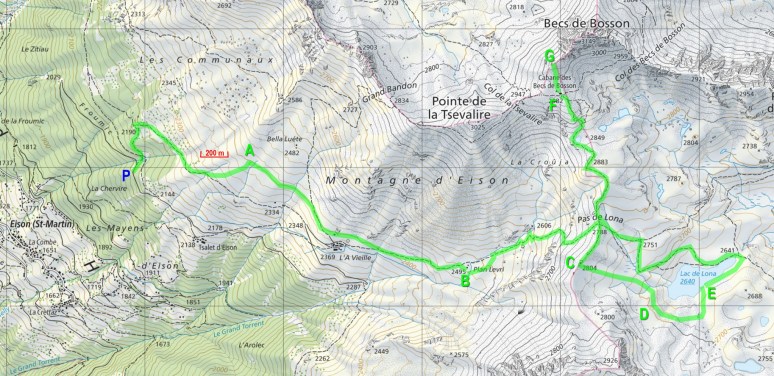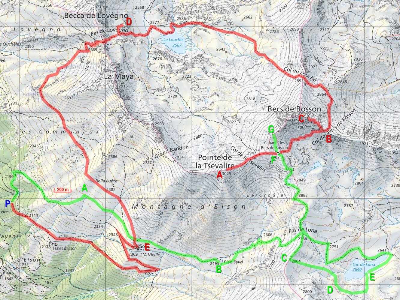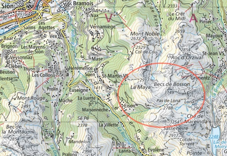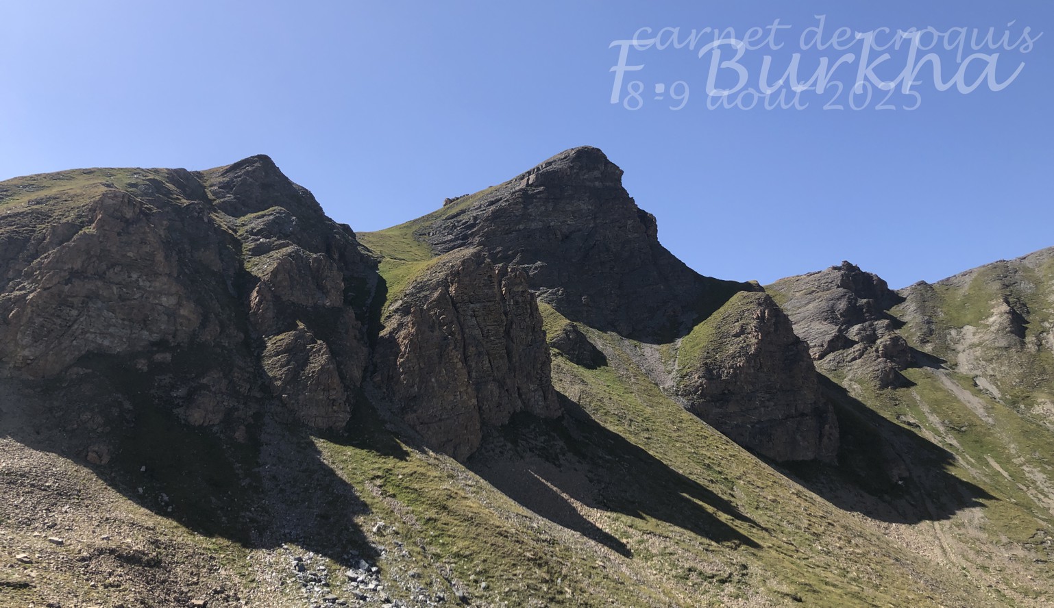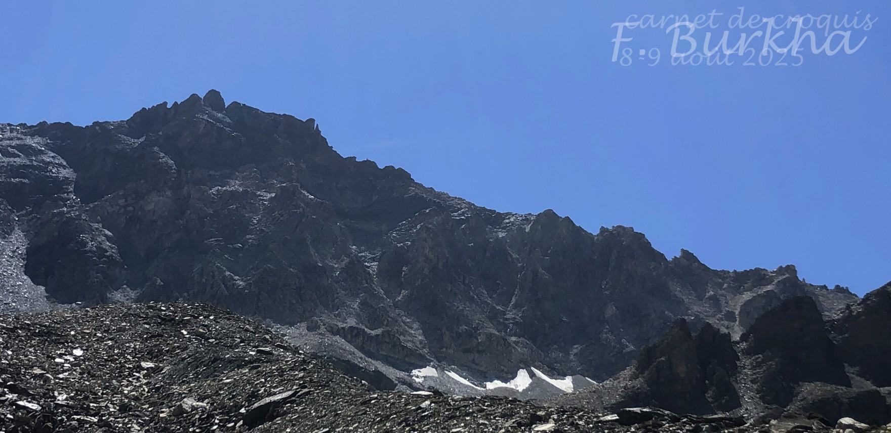 8h30 depuis le sommet de la Tzavolile, 3025 m. (A-rouge sur carte de rando ci-dessus), deuxième aquarelle sommet des Becs de Bosson 3149 m. (C)