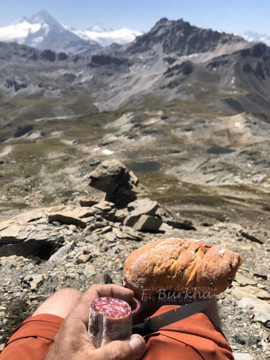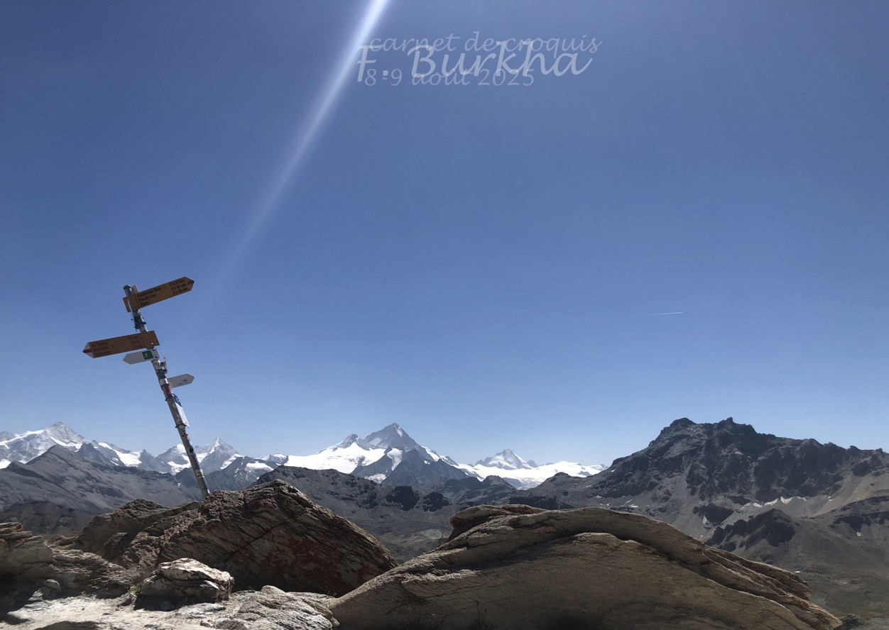 10h00 les Aiguilles Rouges depuis la montée vers le Pas de Lona (B)… arrivée à midi au Pas… après le picnic avec vue sur les 4000 (C)… Obergabelhorn 4064 mètres… puis descente vers (D)…
