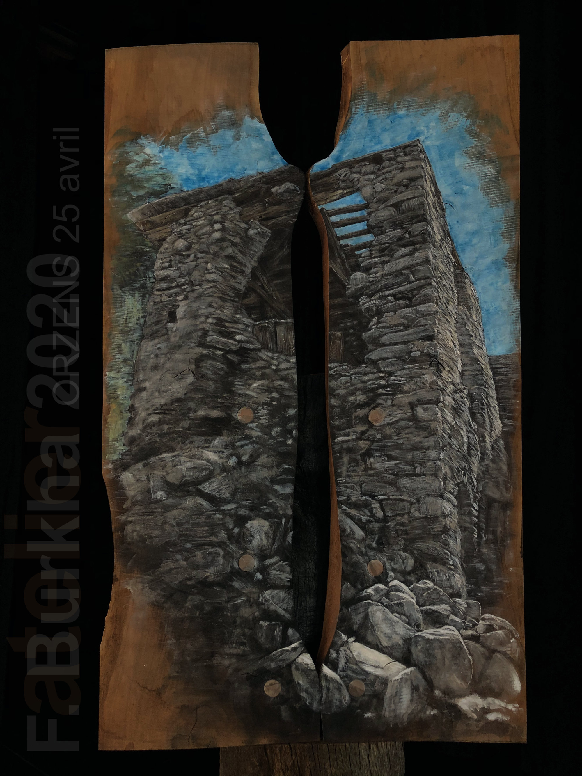 Pierre de moraine; Acrylique, cendres et terres calcinées sur cerisier