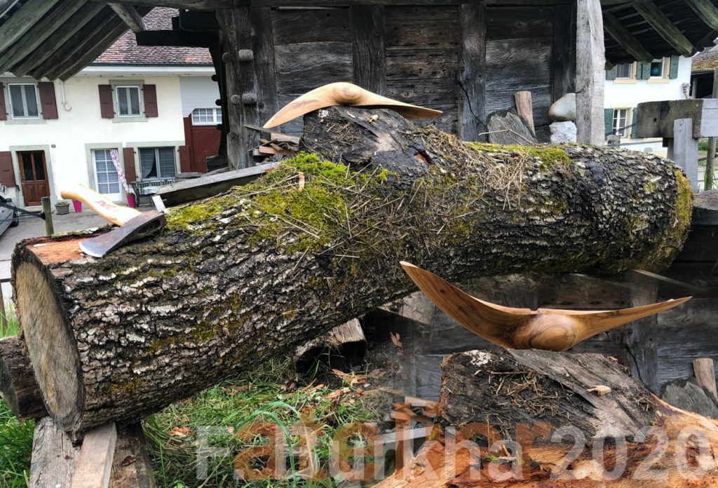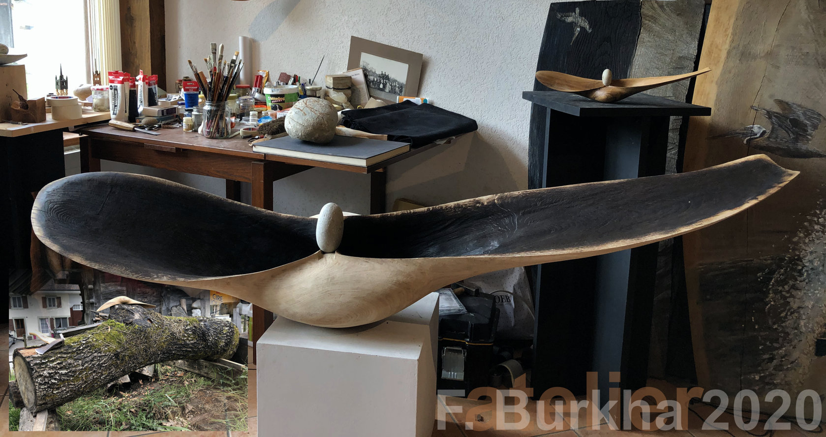 mais la pluie m’a fait battre en retraite – un mobile en chêne de 2 m. le début du travail ce fait en extérieur – et je me suis mis au tour à bois pour l’après-midi!