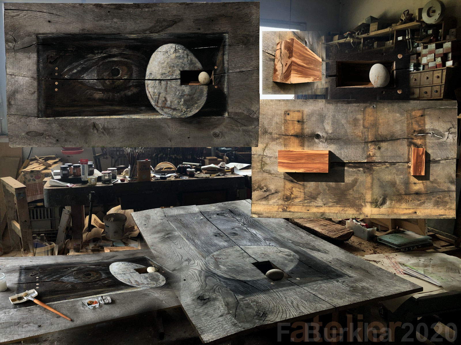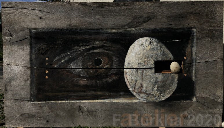 acrylique, cendre, terre et ocres de Vaucluse sur chêne, prunier, if et pierre de moraine. 161/93/13 cm.
