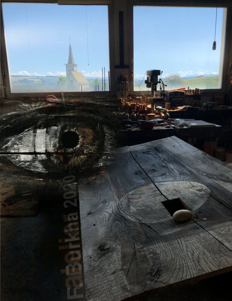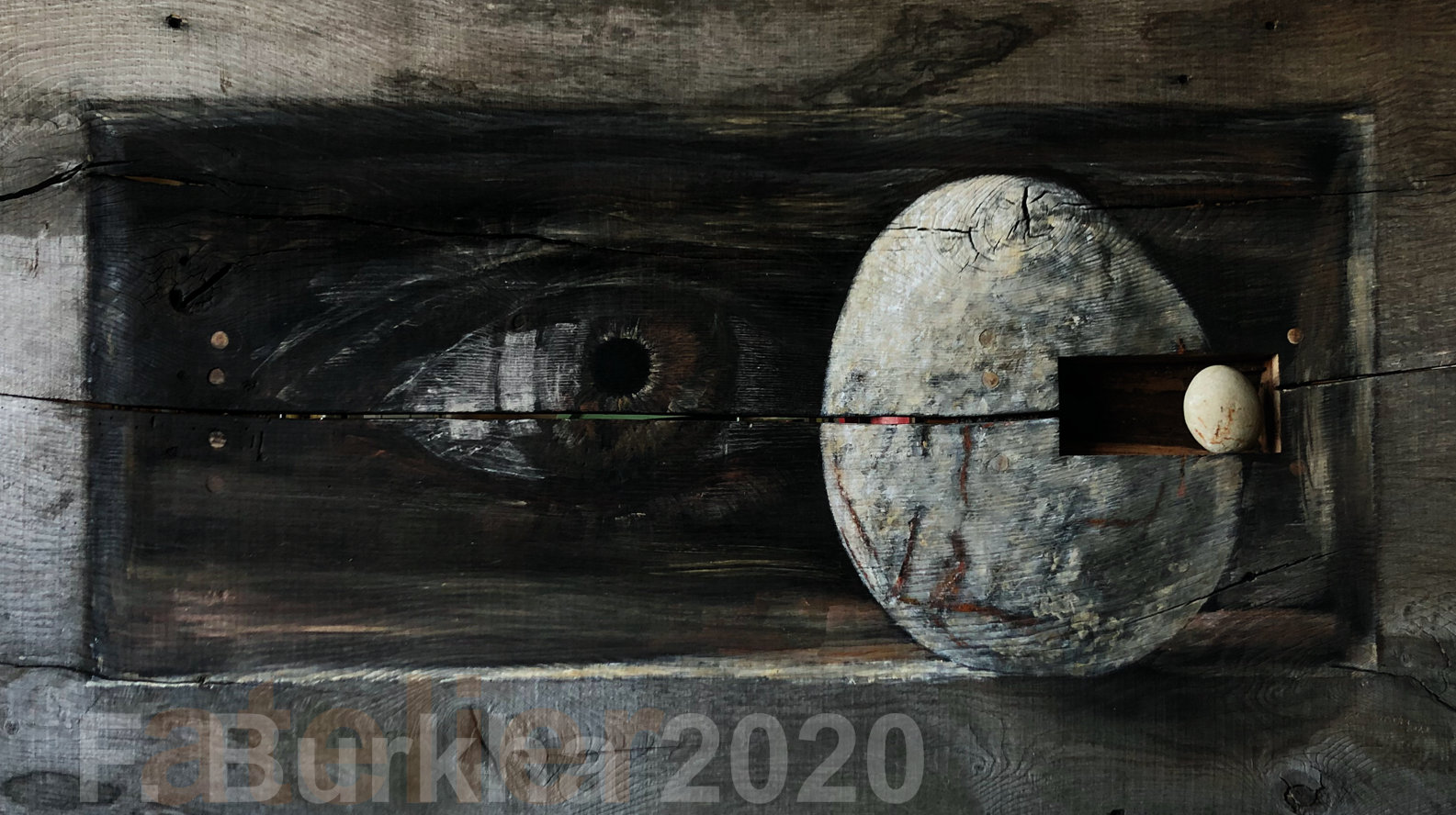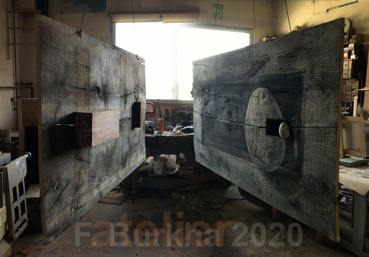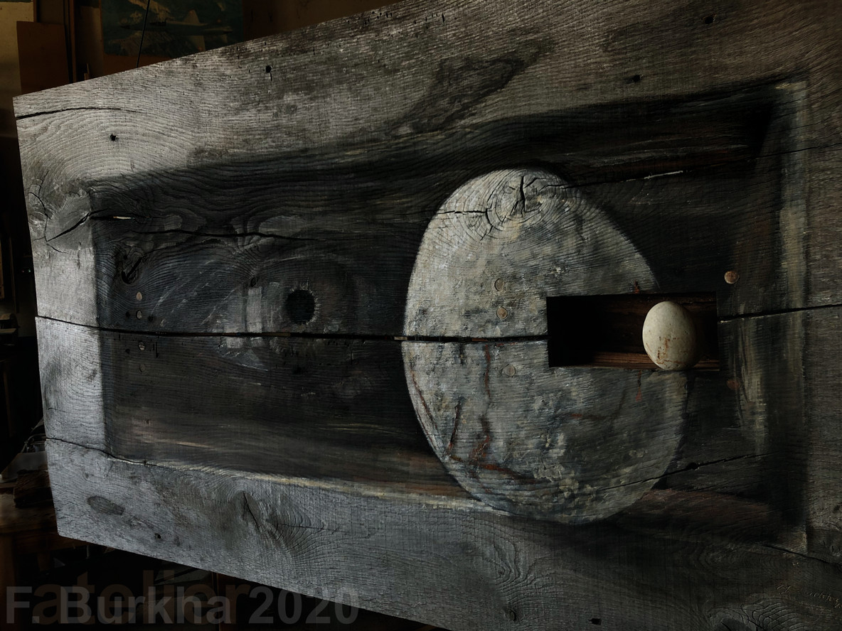 Dernière couche de finition, terre et cendres, sur le trompe l’œil de la sculpture “Boîte noire”, atelier septembre 2020