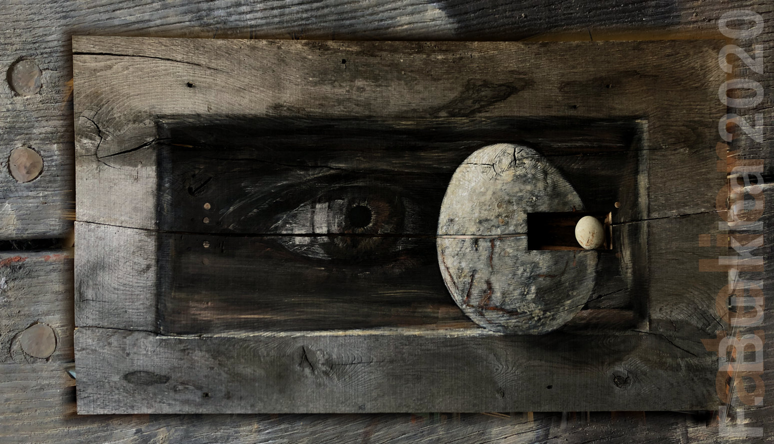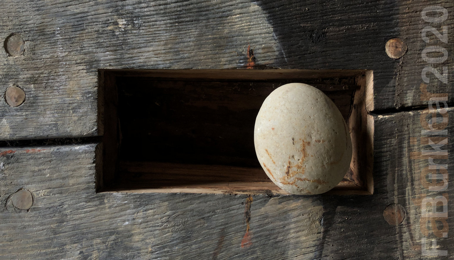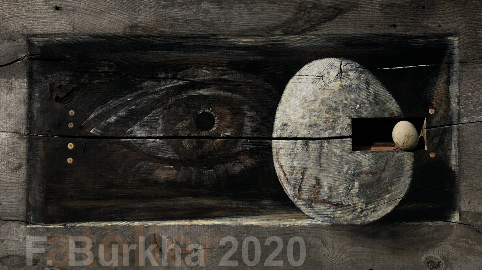Dernière couche de finition, terre et cendres, sur le trompe l’œil de la sculpture “Boîte noire”, atelier septembre 2020
