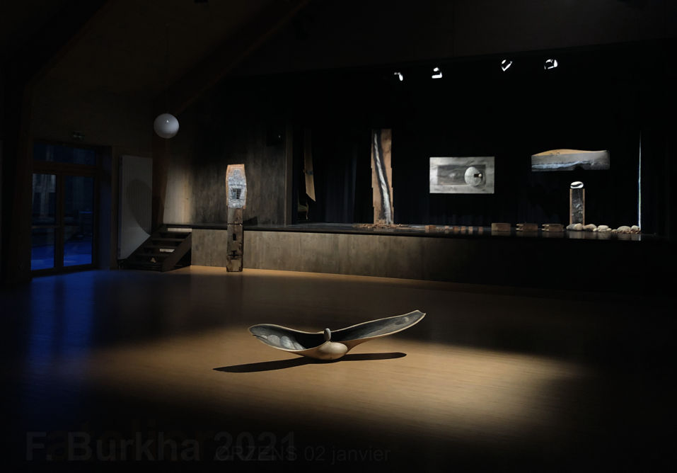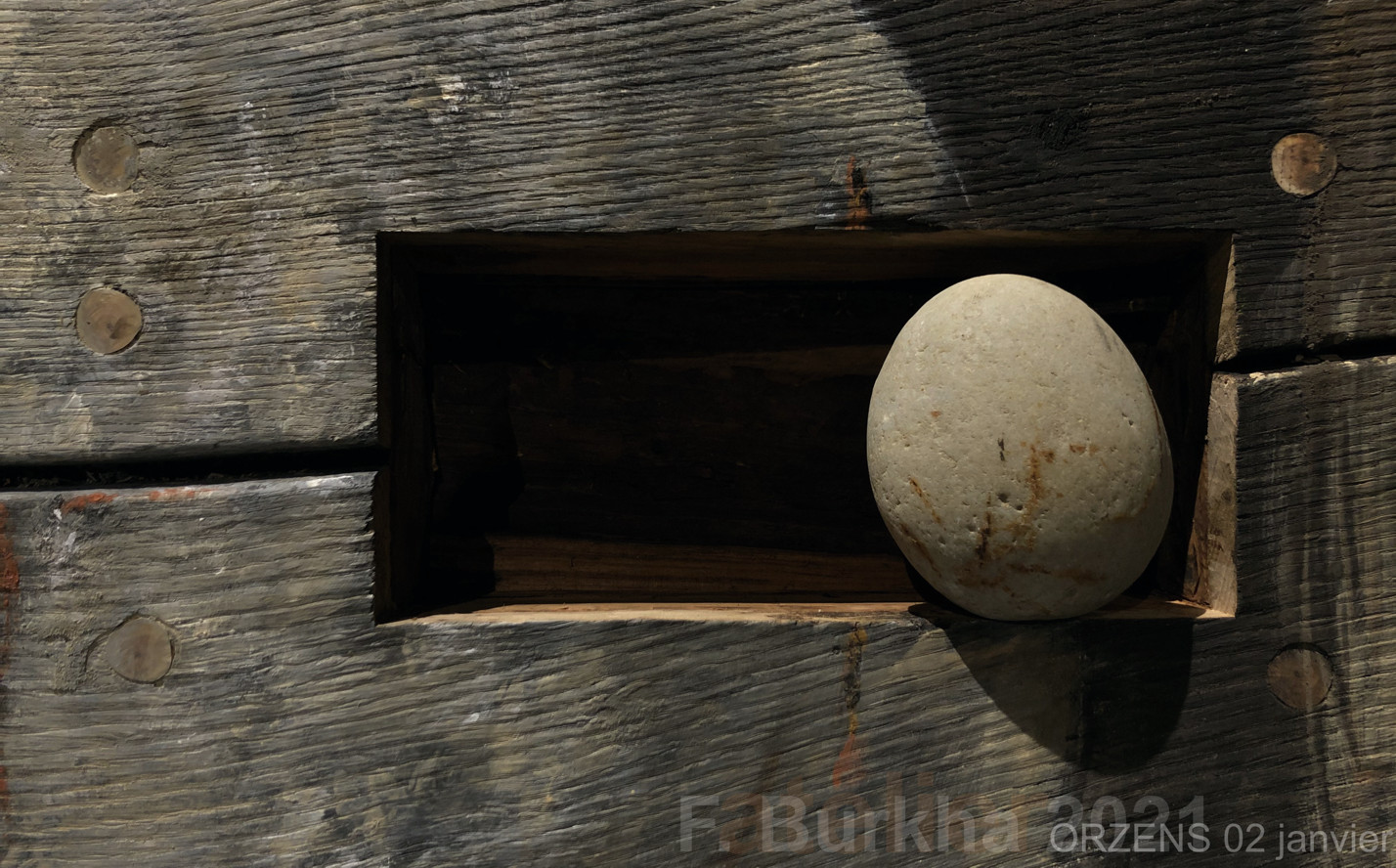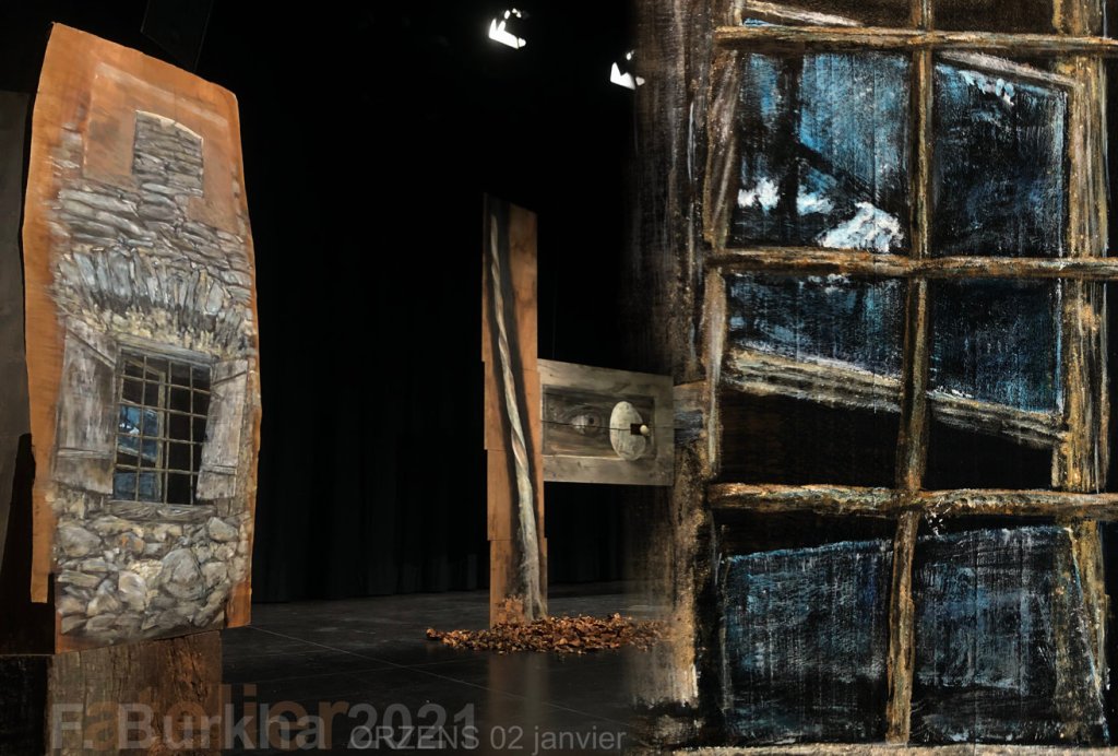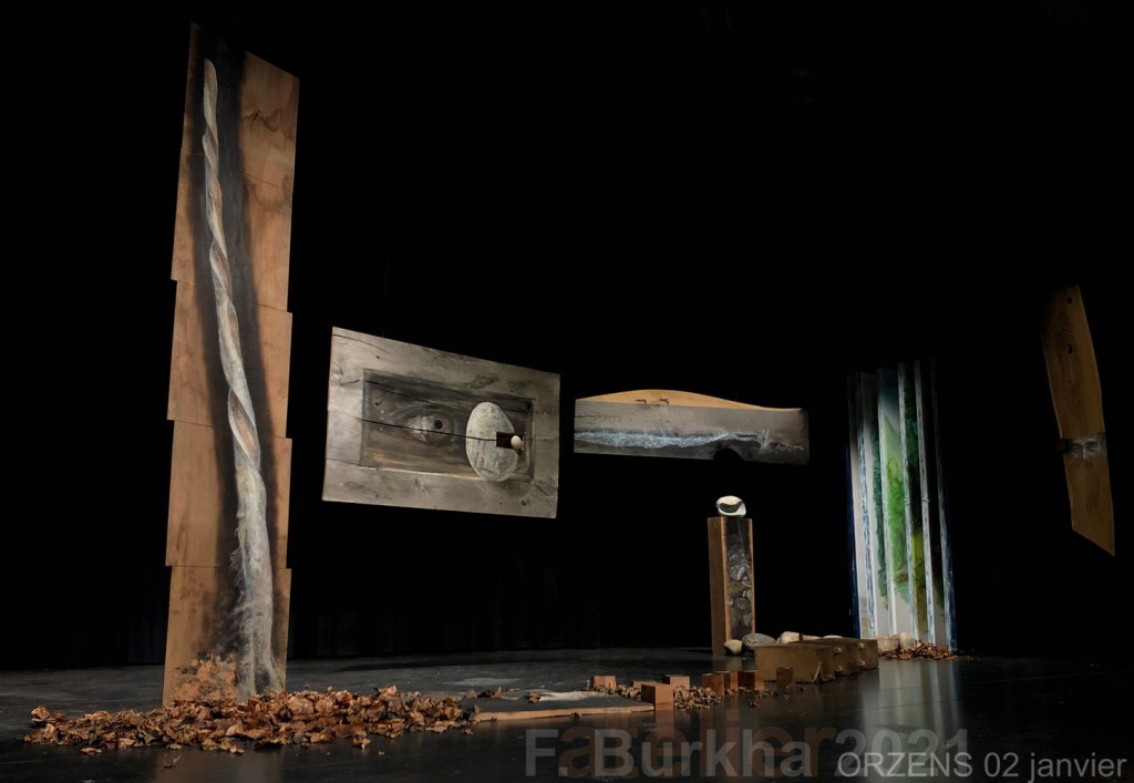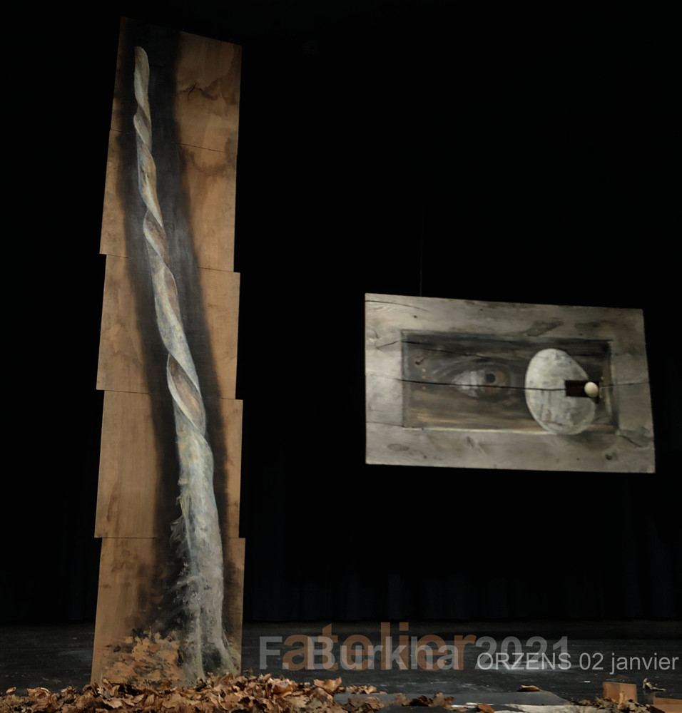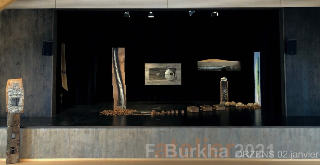 La scène d’Orzens ne pourra accueillir ni acteurs, les répétitions ayant été annulées en octobre, ni spectateurs, la faute à A.B..c, ce mois de janvier 2021; donc j’y ai monté une installation, « Boîte noire », avec des acteurs «Covid-résistants» – en bois, terre, cendres et pierre des champs…
