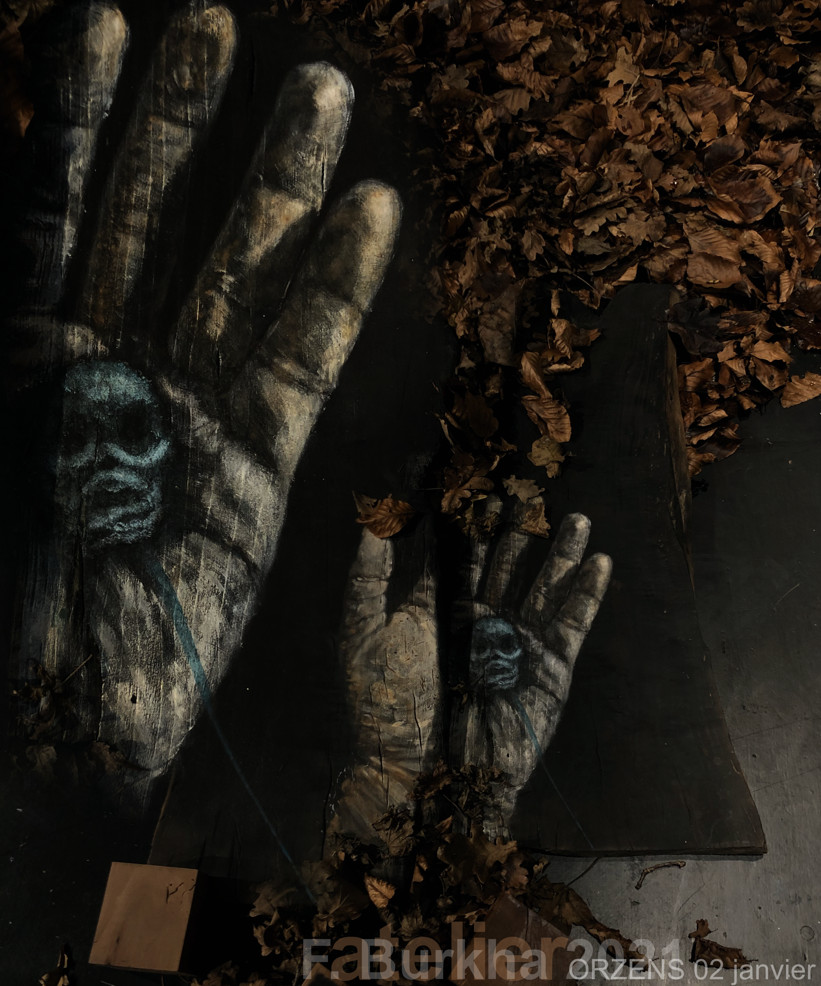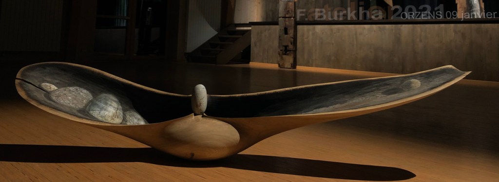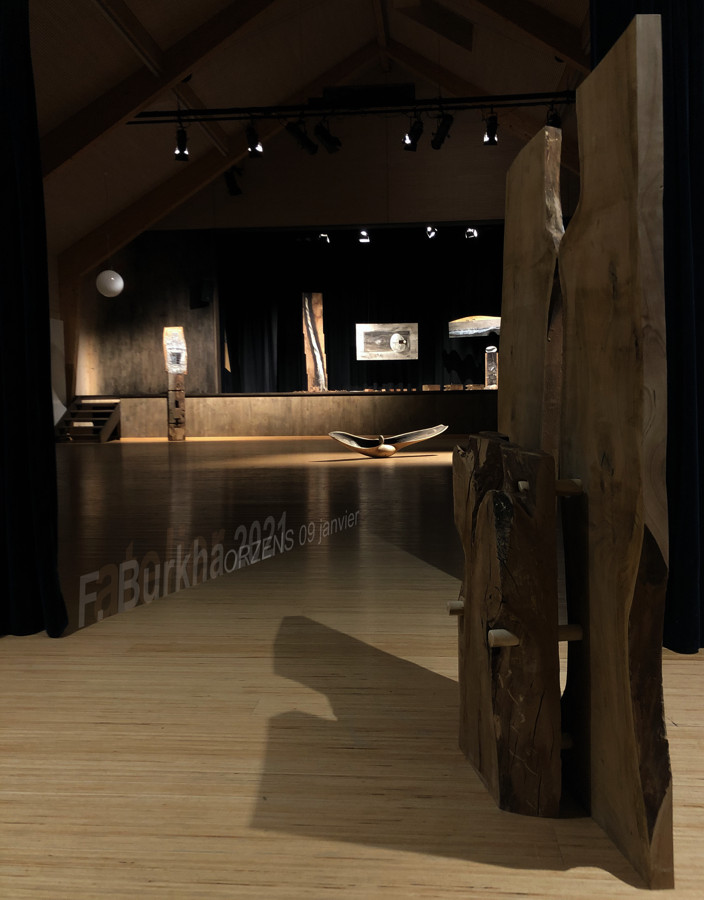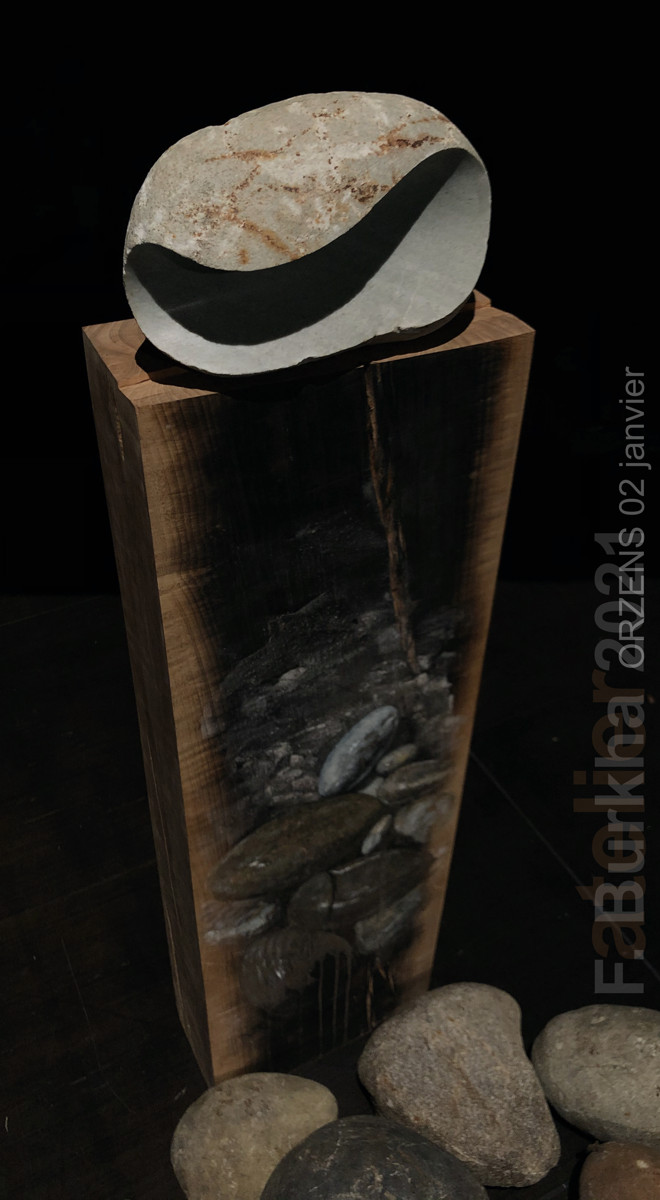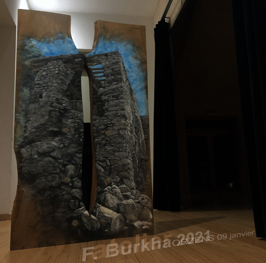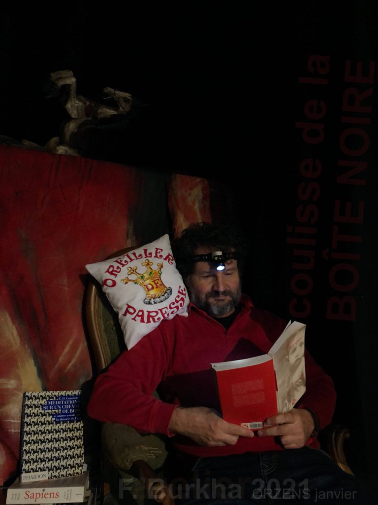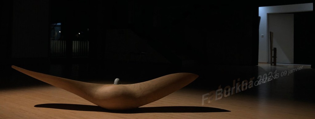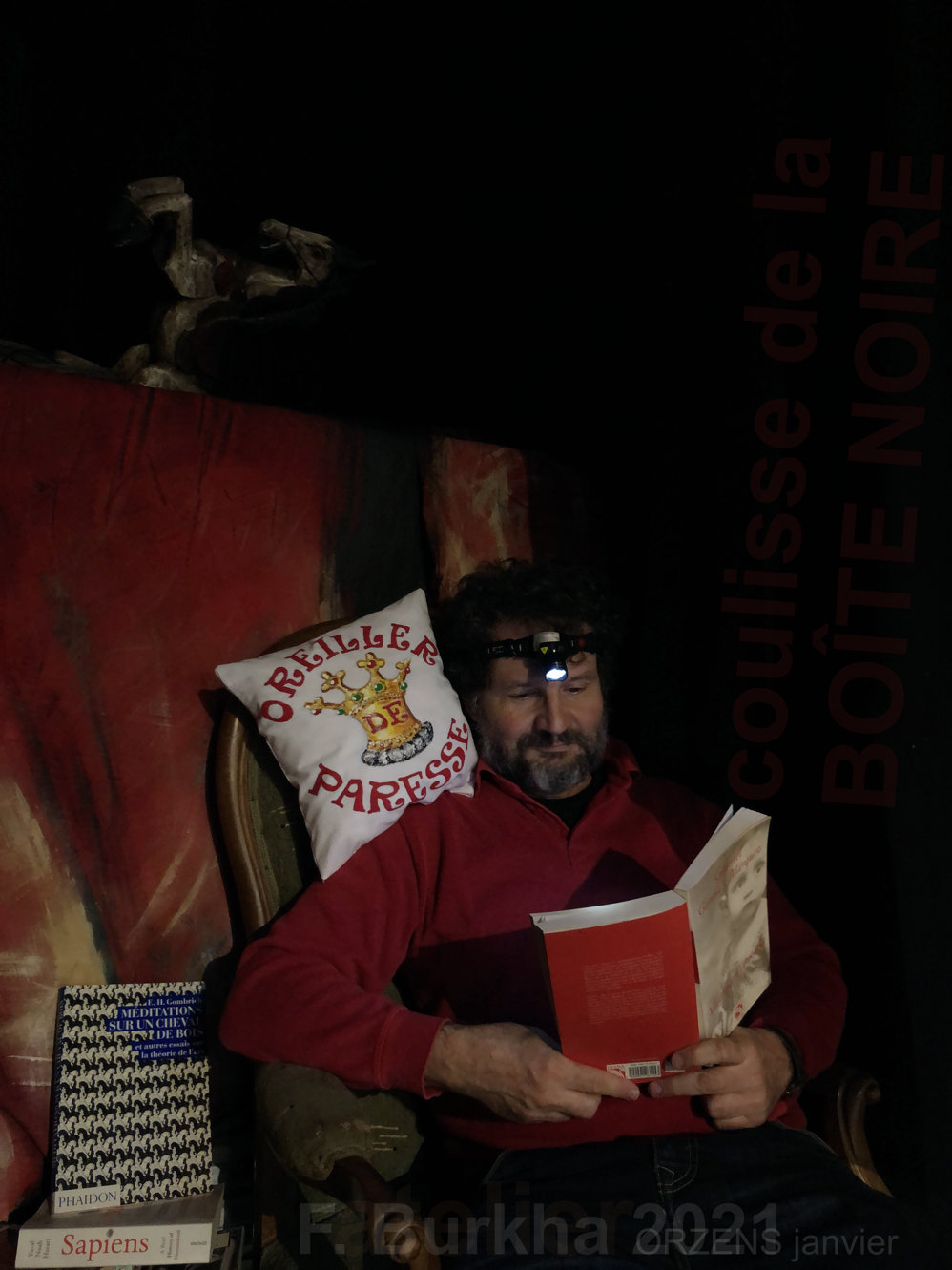 La scène d’Orzens ne pourra accueillir ni acteurs, les répétitions ayant été annulées en octobre, ni spectateurs, la faute à A.B..c, ce mois de janvier 2021; donc j’y ai monté une installation, « Boîte noire », avec des acteurs «Covid-résistants» – en bois, terre, cendres et pierre des champs…