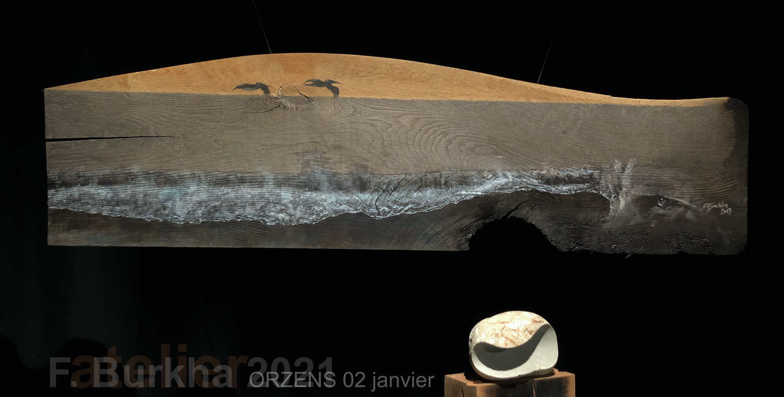 pierre de moraine, if, prunier; acrylique, ocres et cendres sur chêne. 160/13/93cm.
