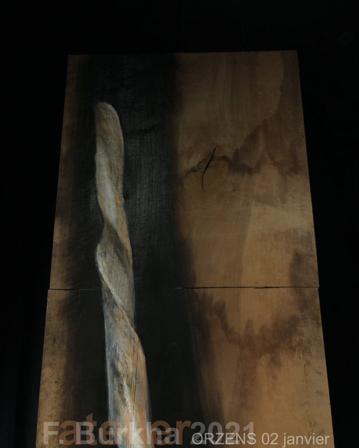 acrylique, ocres, terre et cendres sur cerisier et if. 75/22/127cm.