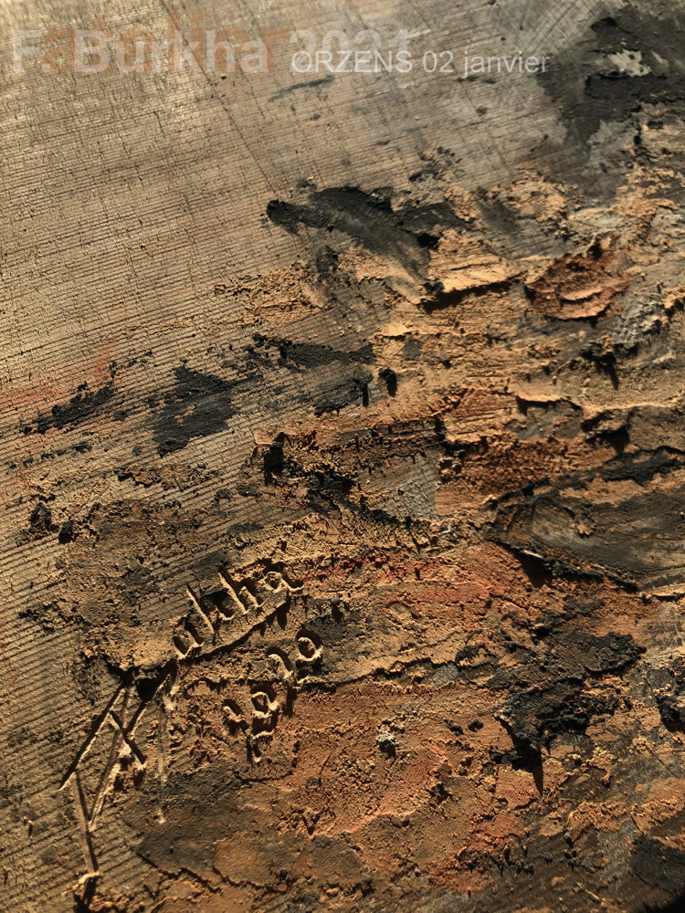 acrylique, terres calcinées, cendres et oxyde de cuivre sur poirier. 58/5/88cm.