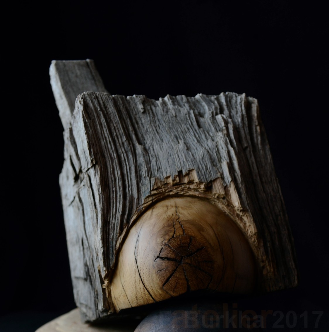 CHIMÈRE DE SOI, if, terre calcinée, cendre et acrylique sur chêne et pierre de moraine. 2018