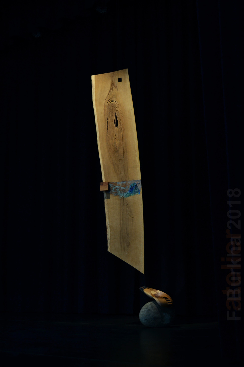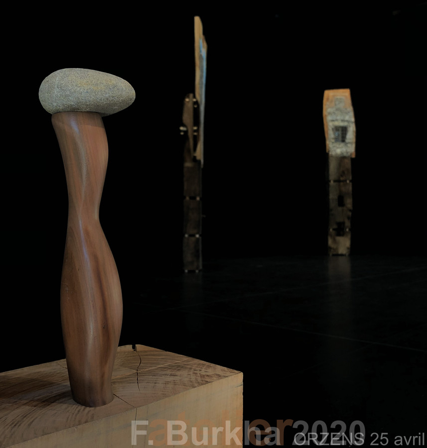 MONSIEUR « JE SAIS TOUT » et l’installation FENÊTRE, pierre de moraine et prunier , acrylique terres et cendres sur cerisier, chêne, if… 2019