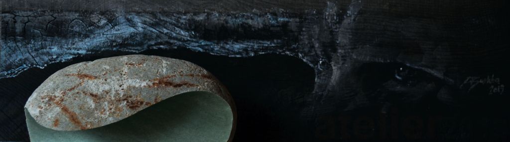 REGARD VAGUE, pierre de moraine, acrylique terres et cendres sur chêne. 2019