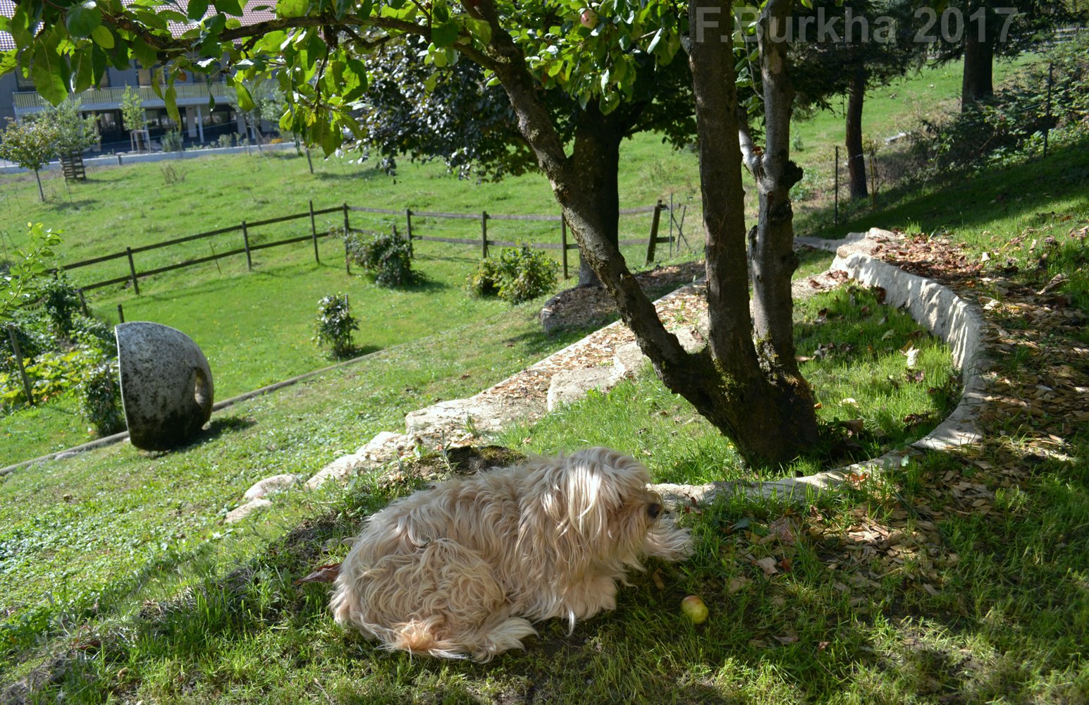 Le deuxième est de créer des cheminements qui facilitent la cueillette des pommes, poire et coings – pas seulement pour le chien! – et mettent en valeur les arbres d’ornement existants.