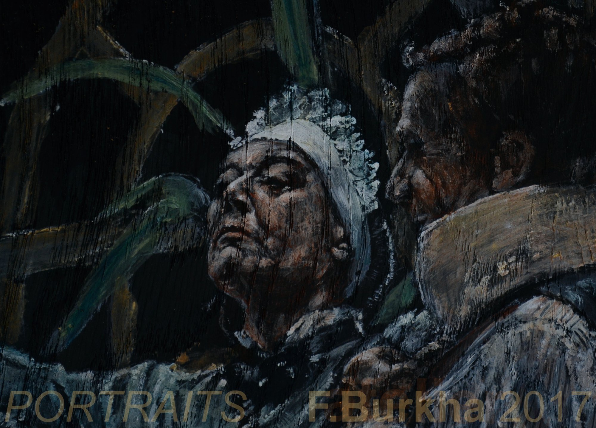 Les portraits sont réalisés sur des planches de chêne. La technique est expliquée sur la page: « PEINTURE-SCULPTURE ou VOLUME/ILLUSION – VOLUME/RÉEL »