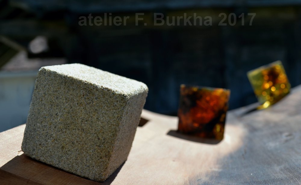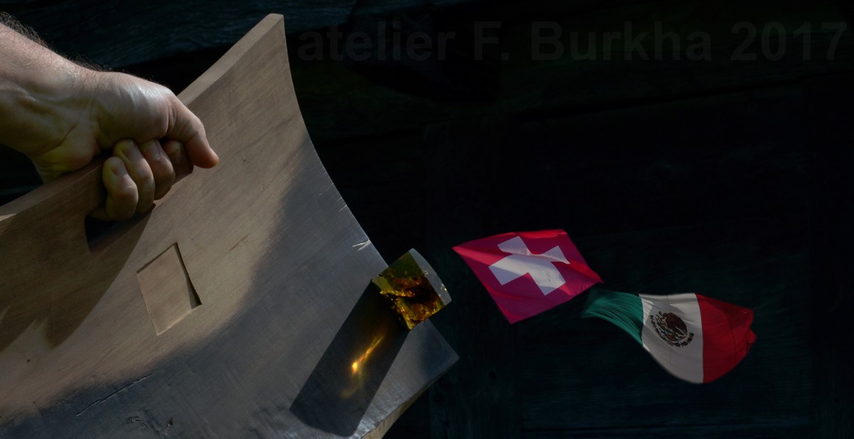 De retour d’une visite à notre famille du Mexique, j’ai pris dans ma valise une pièce d’ambre de Simojovel (800g.) qui faisait partie d’une de mes sculptures, aujourd’hui « recyclée », avec la vague idée de l’intégrer dans une composition sur notre double identité culturelle