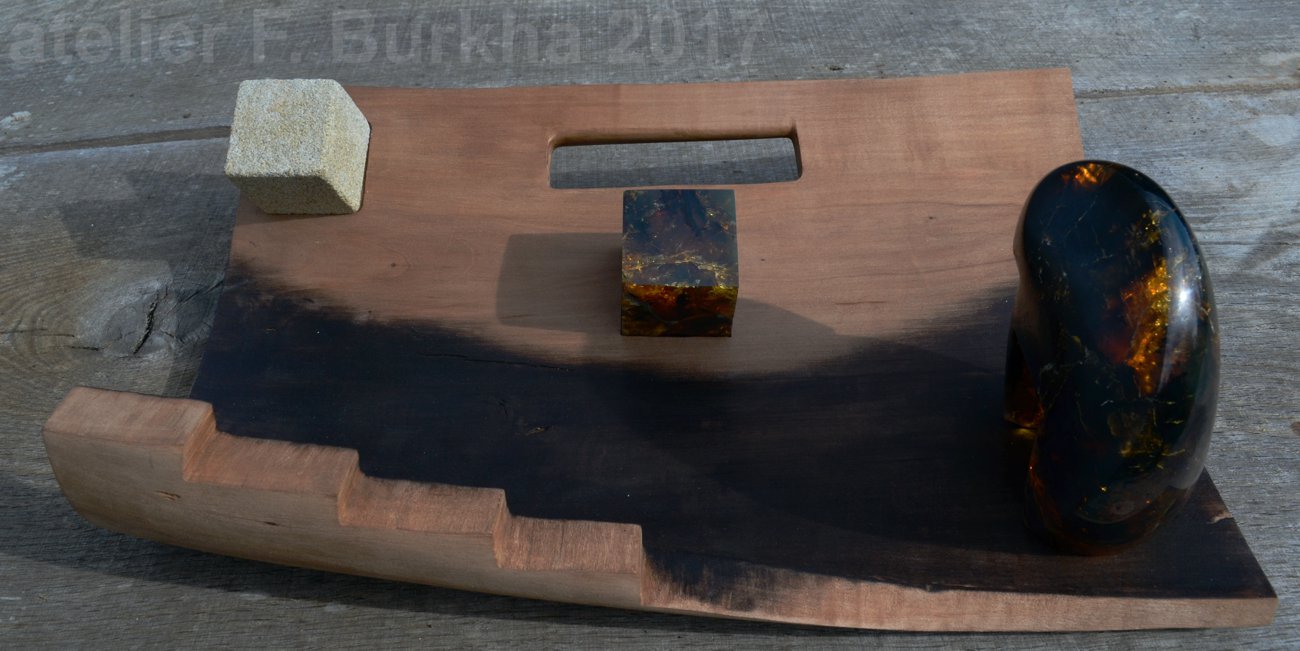 Le bois (poirier), l’ambre et un bloc de molasse de la cathédrale de Lausanne.