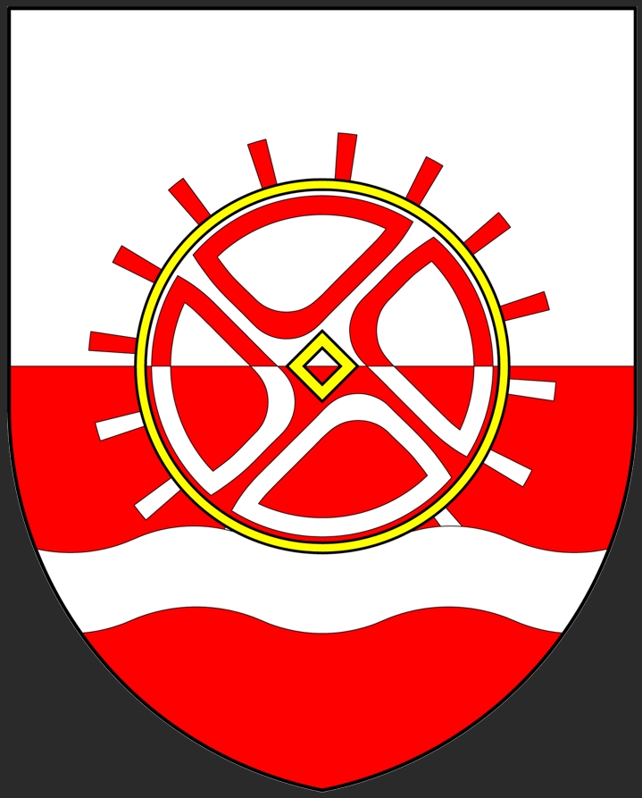 Coupé d’argent et de gueules à la fasce ondée abaissée d’argent, sommée d’une roue à aube de l’un à l’autre, cerclée d’or et au moyeu évidé du même.