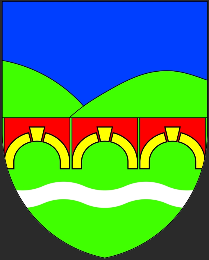 Coupé d’azur au mont de sinople accosté à senestre d’un plus petit du même et de sinople à la fasce ondée d’argent surmontée de trois ponts de gueules aux arches d’or accolés au trait.