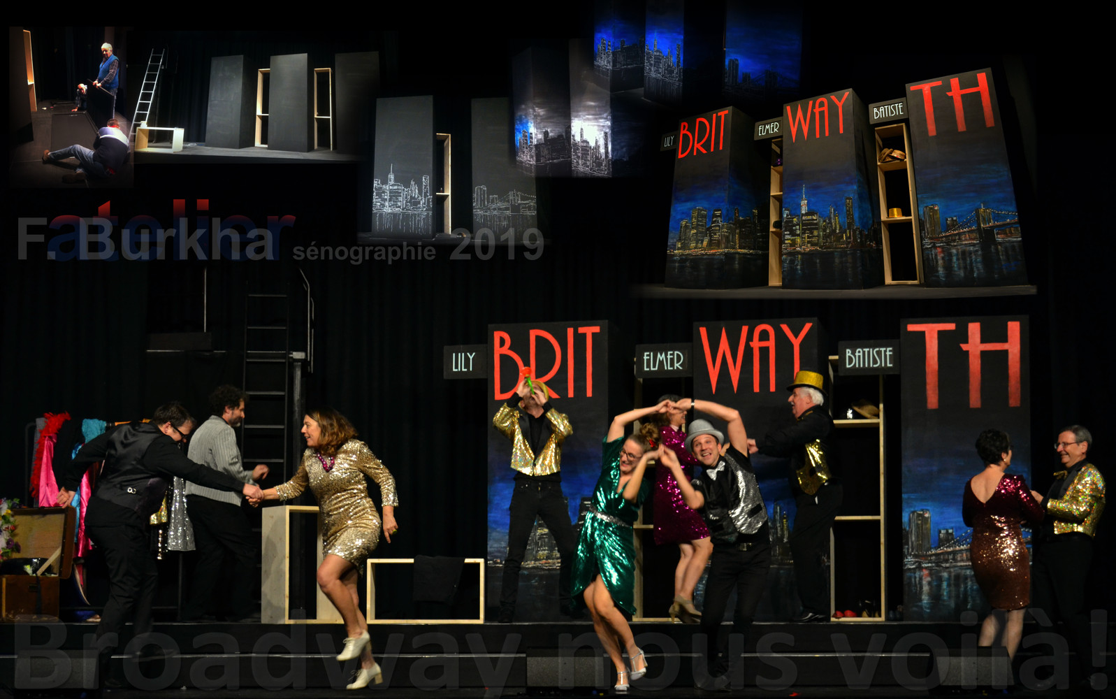 2018-19. Conception et réalisation de la scénographie du spectacle de la troupe d’Argile. « BROADWAY NOUS VOILÀ », comédie de Patrick Haudecoeur. Plus d’info sur https://theatreorzens.info/spectacle-2019/