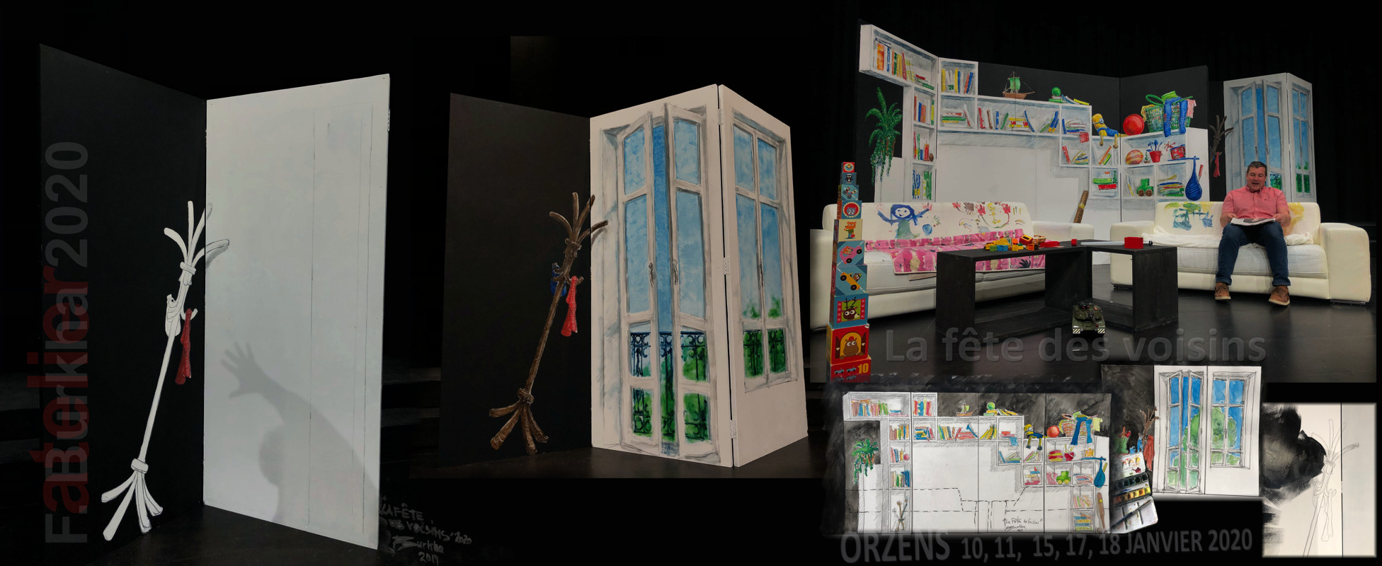 2019-20. Conception et réalisation de la scénographie du spectacle de la troupe d’Argile. « LA FÊTE DES VOISINS », comédie de Yves Moret. Plus d’info sur https://theatreorzens.info/spectacle-2020/