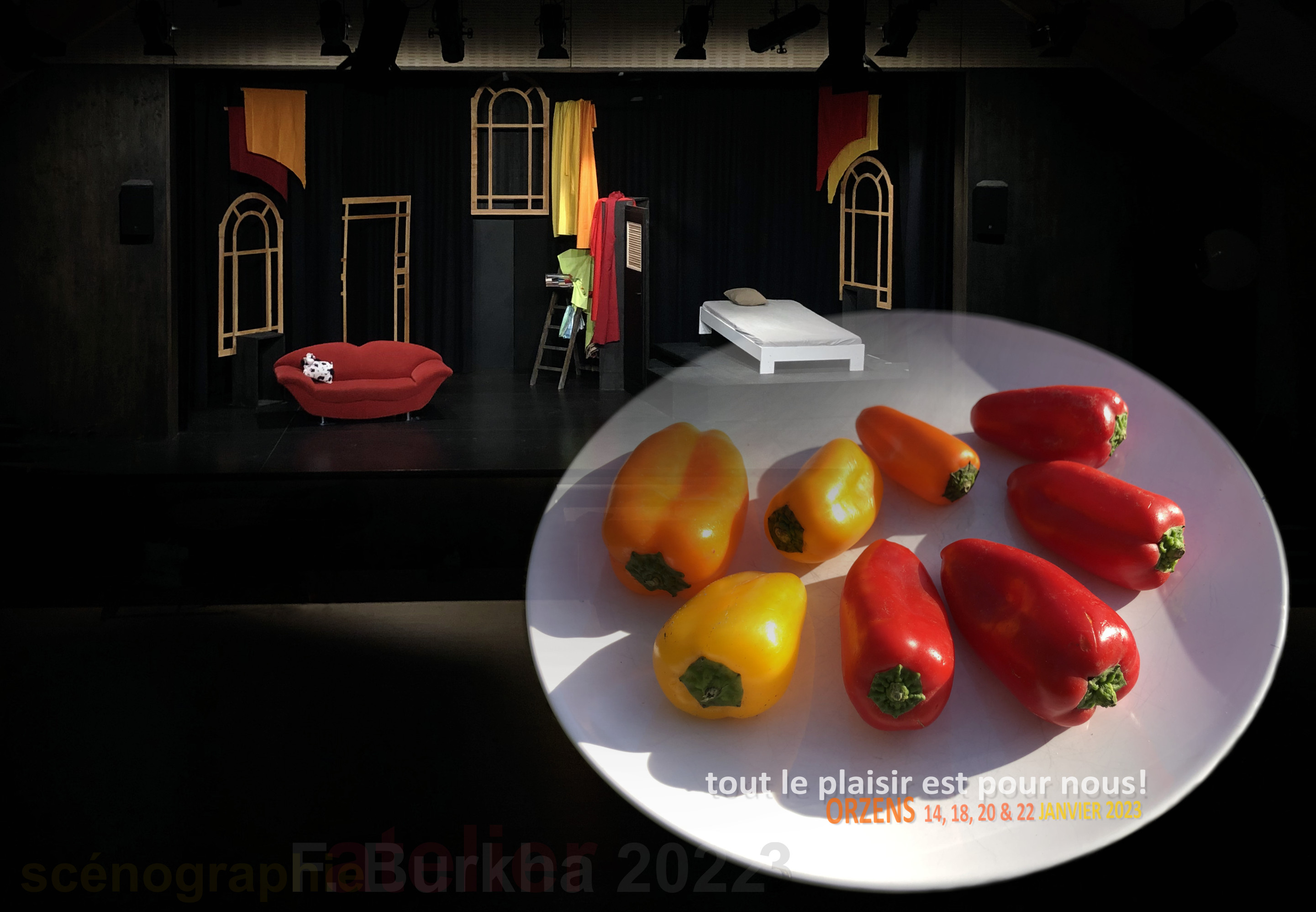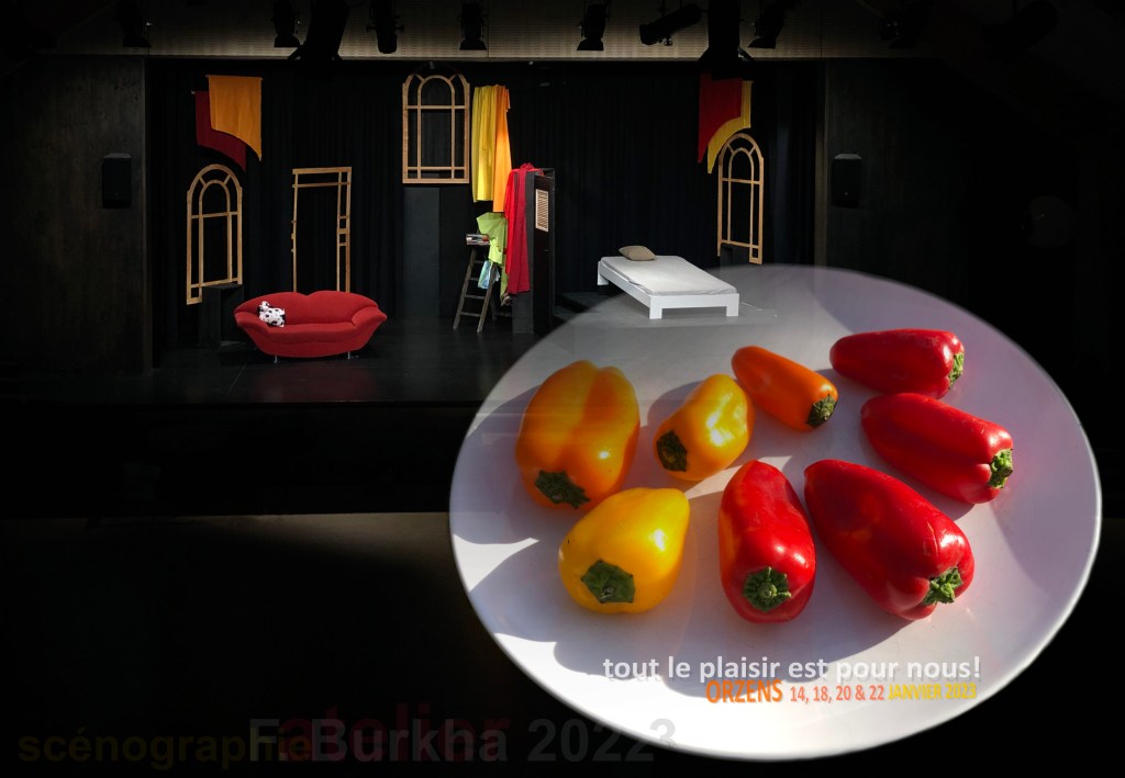Les achats pour le repas de Noël m’ont inspirés les couleurs de la scénographie que j’ai réalisé pour la troupe d’Argile du théâtre d’Orzens. Ces piments conviennent bien à cette comédie « piquante » qu’elle nous a présenté en ce début d’années 2023: