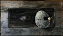 Dernière couche de finition, terre et cendres, sur le trompe l’œil de la sculpture “Boîte noire”, atelier septembre 2020